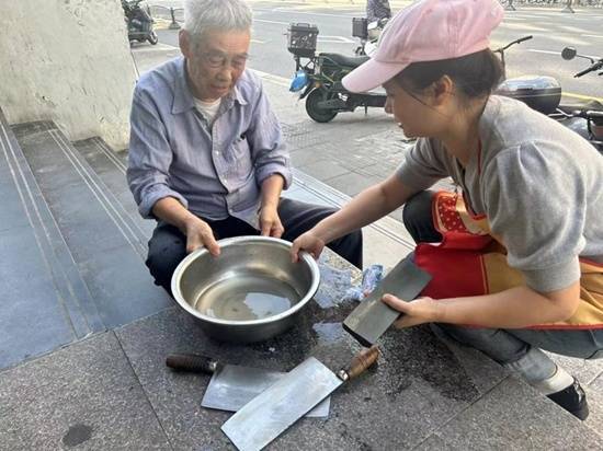 ▲老人在店门前打磨好菜刀,李昌吉的妻子对他表示感激